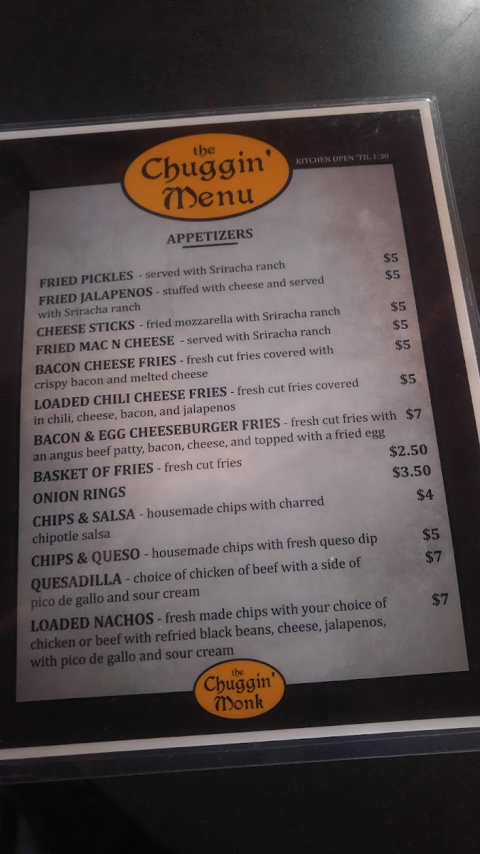 Introducing The Chuggin' Monk, an inviting eatery located at 2301 N Collins St Ste. 170 in Arlington, TX. This neighborhood gem offers a vibrant menu that makes it a must-visit for food lovers. Begin your culinary adventure with their tantalizing appetizers: crispy Fried Mac N Cheese, golden Fried Mushrooms, or Jalapeno Cheese Sticks, all priced at $11.50. For something heartier, try the Bacon Cheese Fries or the unique Bacon, Egg, Cheeseburger Fries.